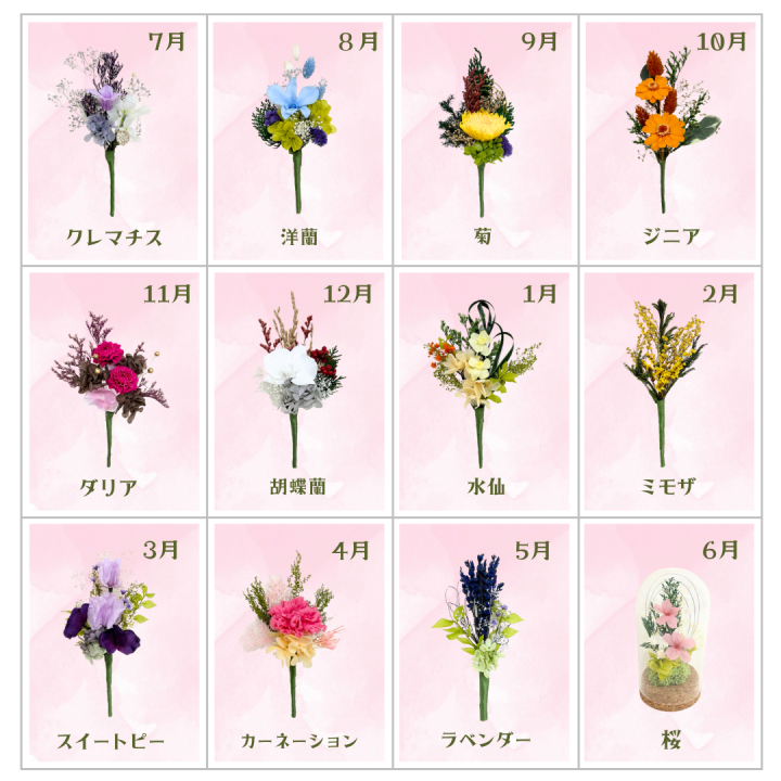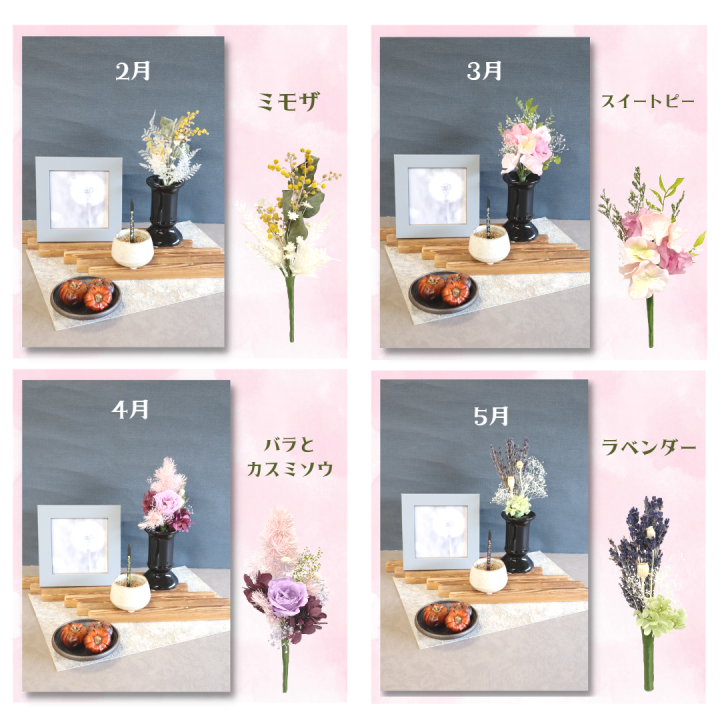 2月 如月花香る(スイートピー)、3月 弥生桜舞う(桜)