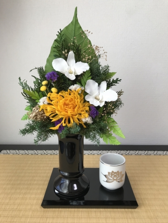 最終月の9月に定番の菊をメインにした花器付きの大ぶりのお供え花をお届け。